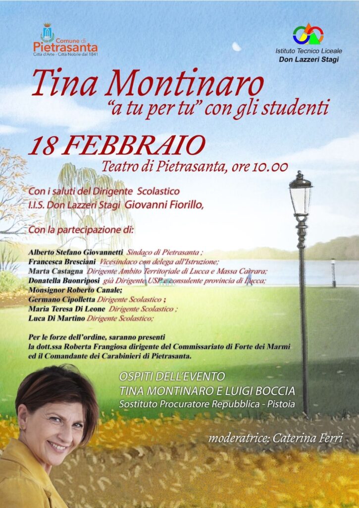 Martedì 18 febbraio, alle ore 10:00, il Teatro Comunale di Pietrasanta sarà il palcoscenico di un importante momento di riflessione dedicato alla legalità e all’impegno civile. L’evento, intitolato *“Tina Montinaro: a tu per tu con gli studenti”*, vedrà come protagonisti Tina Montinaro, moglie di Antonio, caposcorta di Giovanni Falcone, ucciso nella strage di Capaci del 1992, e Luigi Boccia, Sostituto Procuratore della Repubblica presso il Tribunale di Pistoia.